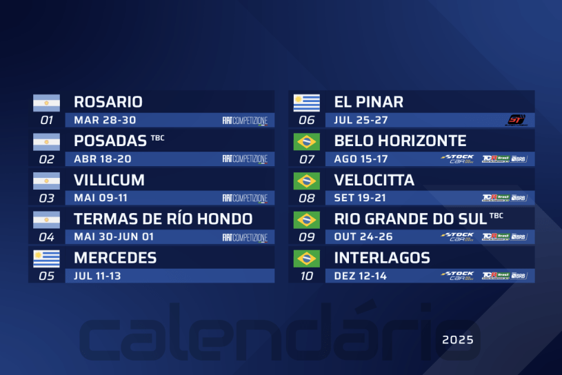 Como de costume no TCR South America Banco BRB, o calendário será o inverso do ano anterior, começando na Argentina, passando pelo Uruguai e encerrando no Brasil. A primeira data será em Rosário (Santa Fé), o mesmo local onde o brasileiro Pedro Cardoso conquistou o título da temporada 2024 e o uruguaio Enrique Maglione venceu a Copa Trophy. O fim de semana de 29 e 30 de março marcará o início da nova temporada.