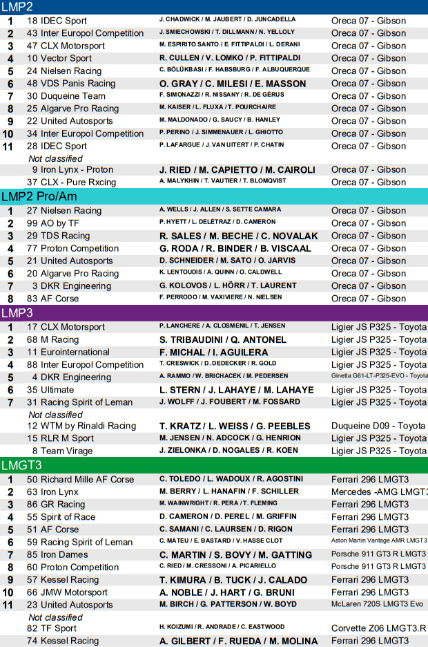 LMP2 Pro-Am: A equipe Nielsen Racing, representada por James Allen, Sérgio Sette Câmara e Anthony Wells conquistou a vitória na categoria, demonstrando desempenho sólido e estratégia eficaz ao longo da corrida. LMP3: A CLX Motorsport com Paul Lanchere, Adrien Closmenil e Theodor Jensen levou a melhor na categoria, destacando-se pela consistência e habilidade em meio às condições desafiadoras da pista.